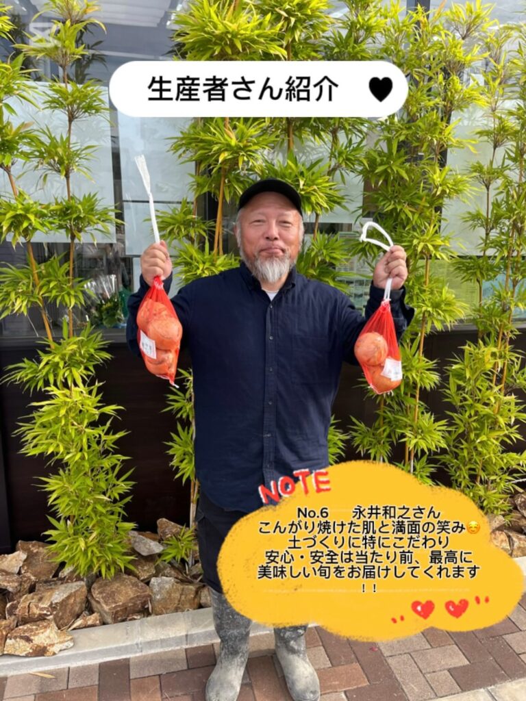 永井和之 さん 2025年12月17日2025年12月17日新着情報 第6弾は… 永井和之 さん こんがり焼けた肌で、ちょっとコワモテ⁈ でも話してみると満面の笑みで話してくれる とても優しい若手農家さんです! 土づくりに特にこだわっていて、 土が良ければ、元気な野菜が育つ!! 安心でそして美味しく…そんな想いで 毎日農作業に励んでおられます!! ぜひ、お手に取ってみて下さいね⭐︎